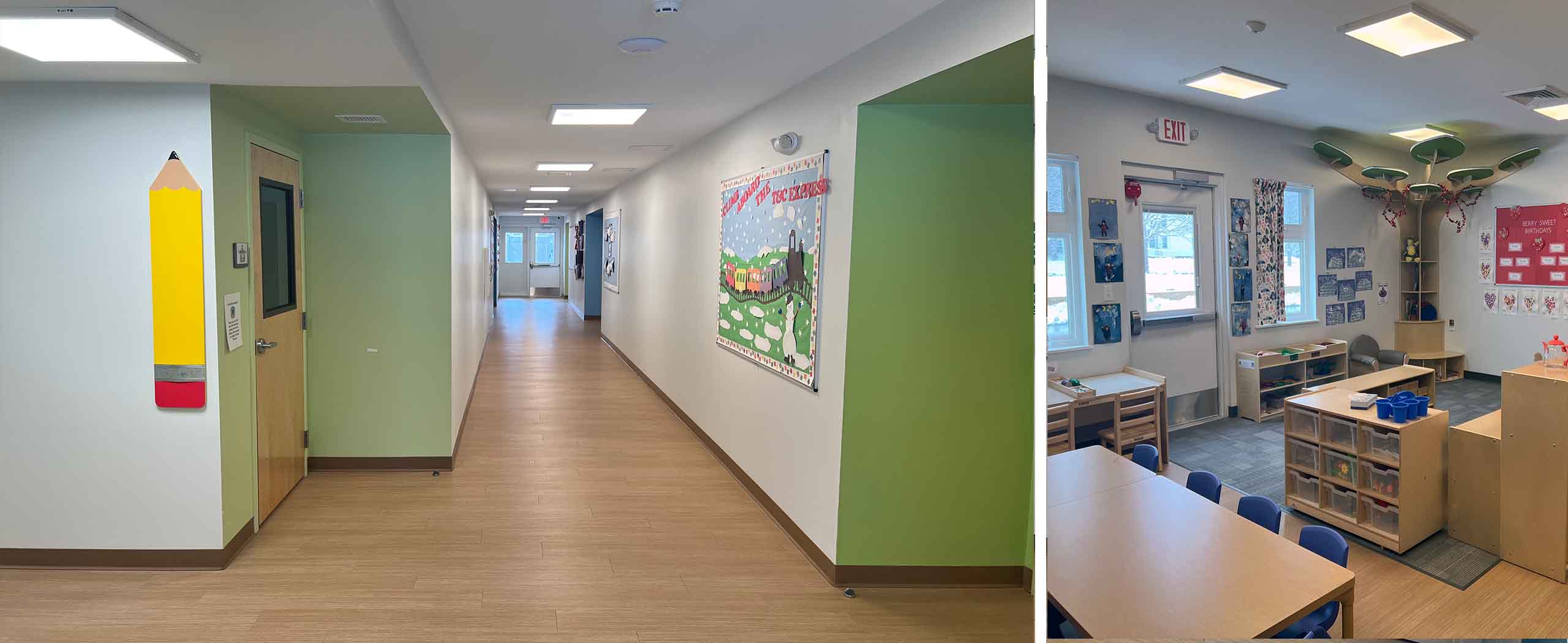 This 3,000 sf renovation and 6,000 sf addition to a former bank building in Colchester, CT has created the newest (and third location) for Town & Country Early Learning Center whose mission is to provide a nurturing, educational and secure environment for young children. The new building supports that mission by providing spaces that are designed for the safety and comfort of children and caregivers and offers peace of mind to parents who can consider the building a home away from home during the work week.