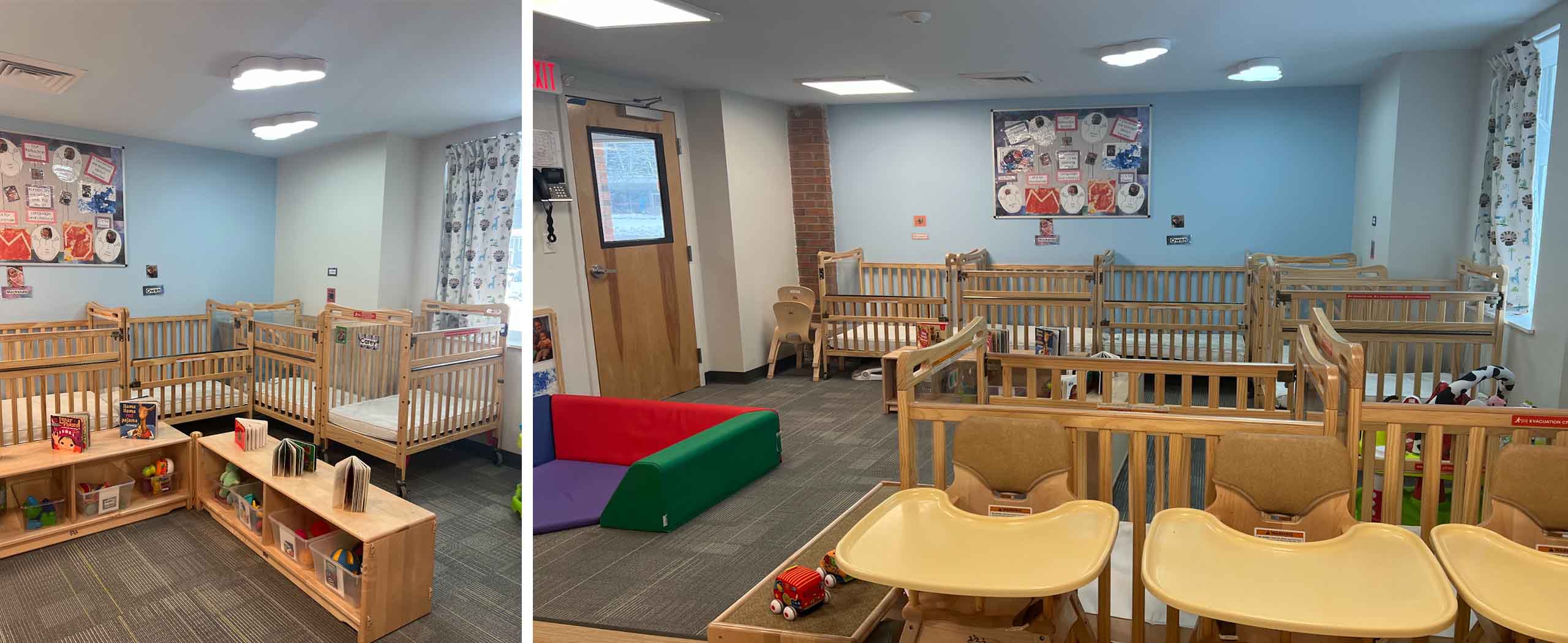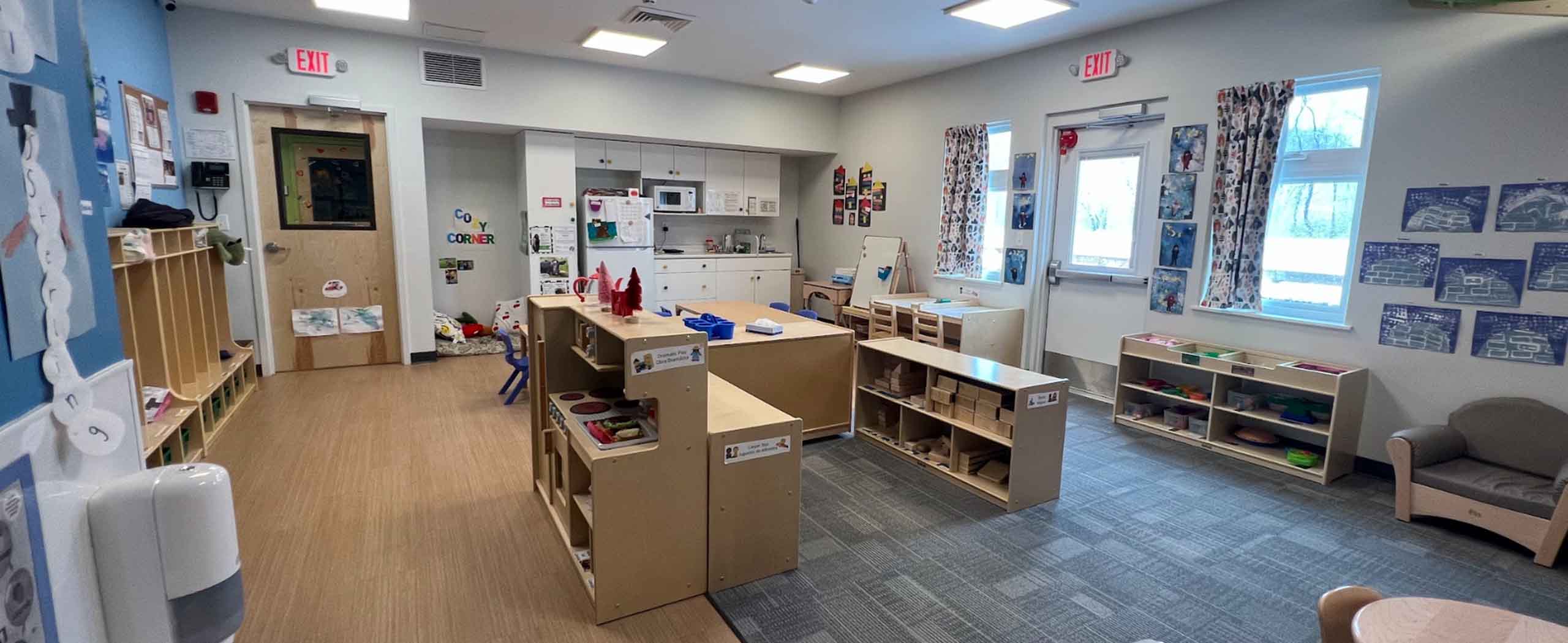 Also on display are many safety features including child safe electrical outlets; child height water closets and sinks; centrally located changing stations with integral sinks situated so that care givers never take their eyes off of the children in their care; individually controlled HVAC systems for each classroom, providing heating, cooling and outside air ventilation; a centralized “home-like” kitchen complete with appliances and outfitted with warm, wood cabinetry. Additional security features include a central entry lobby protected by a card access system, closed circuit security cameras and exit doors in each room.