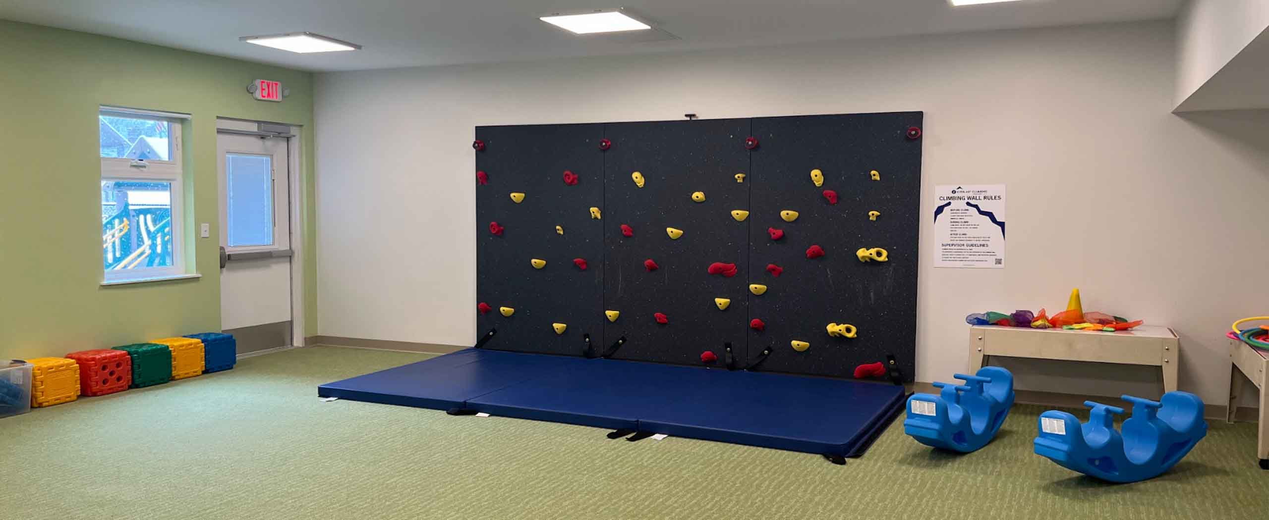 The interiors convey a playfulness that is intended to exude a safe and welcoming space while stimulating creativity and imagination. Natural materials, earth tone colors, ceiling lights shaped like clouds and tree sculptures with big green leaves (that double as acoustic panels) are a few examples on display and are incorporated into classrooms for all including infant, toddler and pre-school/kindergarten spaces.
