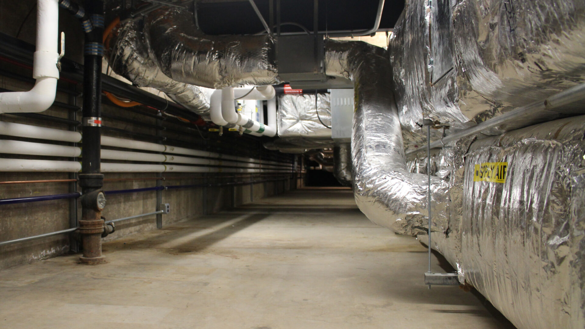 Additional measures were also taken to do heavier infrastructure work in the early morning (usually between 5 & 8 am) before occupants arrived for work. A good portion of this work involved demoing/installing duct work, electrical and plumbing systems that were all housed in a tunnel that ran the length of the lab under the building. This extremely challenging and very tight space required careful coordination for the organization of new systems – the addition of new lighting and an access ladder greatly improved the ability to provide future maintenance.